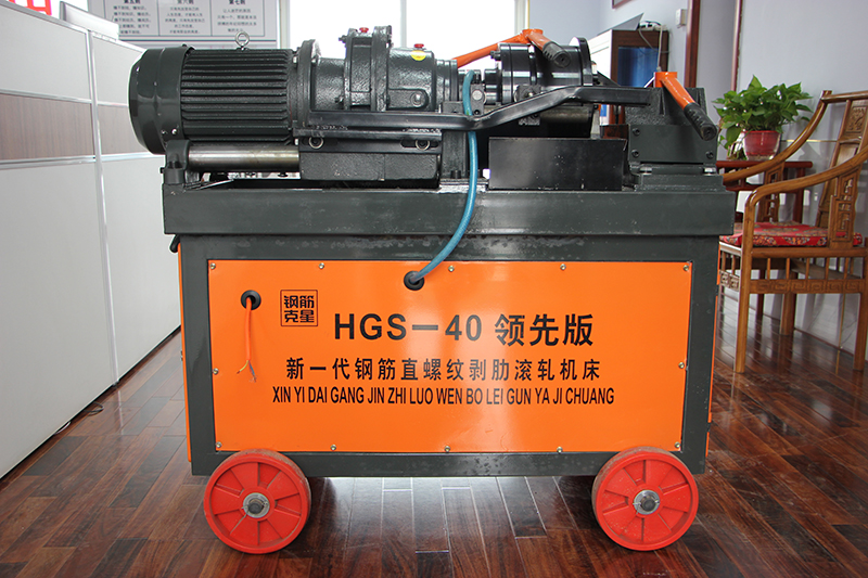 HGS-40型鋼筋直螺紋滾絲機:由機架、夾緊鉗、導軌、滑套、擺線針輪減速機、剝肋滾軋頭、進給機構(gòu)、自動開合機構(gòu)、行程限位機構(gòu)、冷卻系統(tǒng)、電器控制箱、控制系統(tǒng)等部分組成。